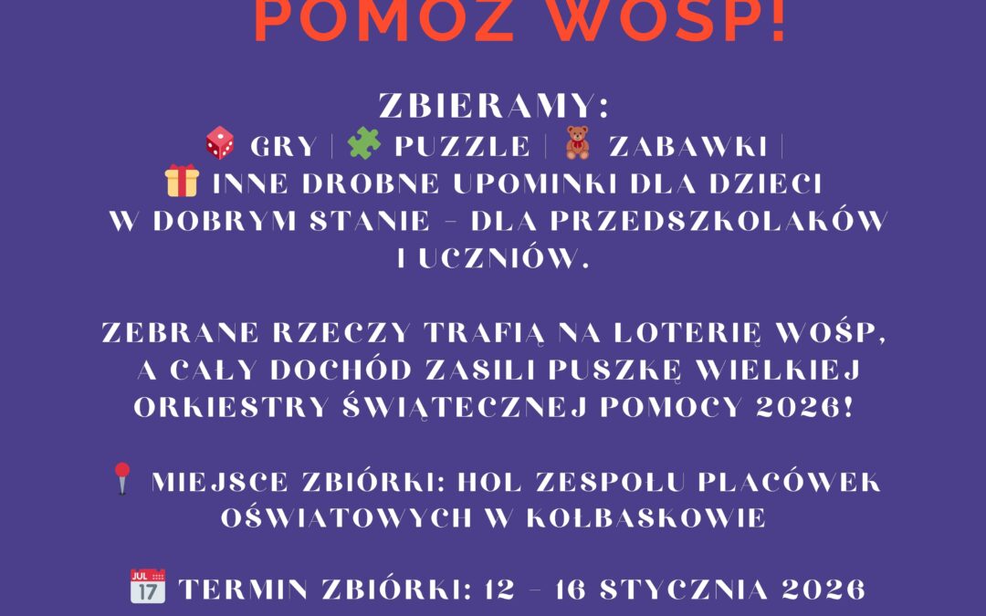 Zbieramy gry, puzzle, zabawki oraz inne drobne upominki dla dzieci (w dobrym stanie), które zostaną przeznaczone na loterię fantową WOŚP organizowaną na terenie szkoły. Cały dochód z loterii zasili puszkę WOŚP 2026.
