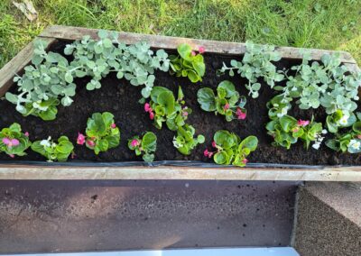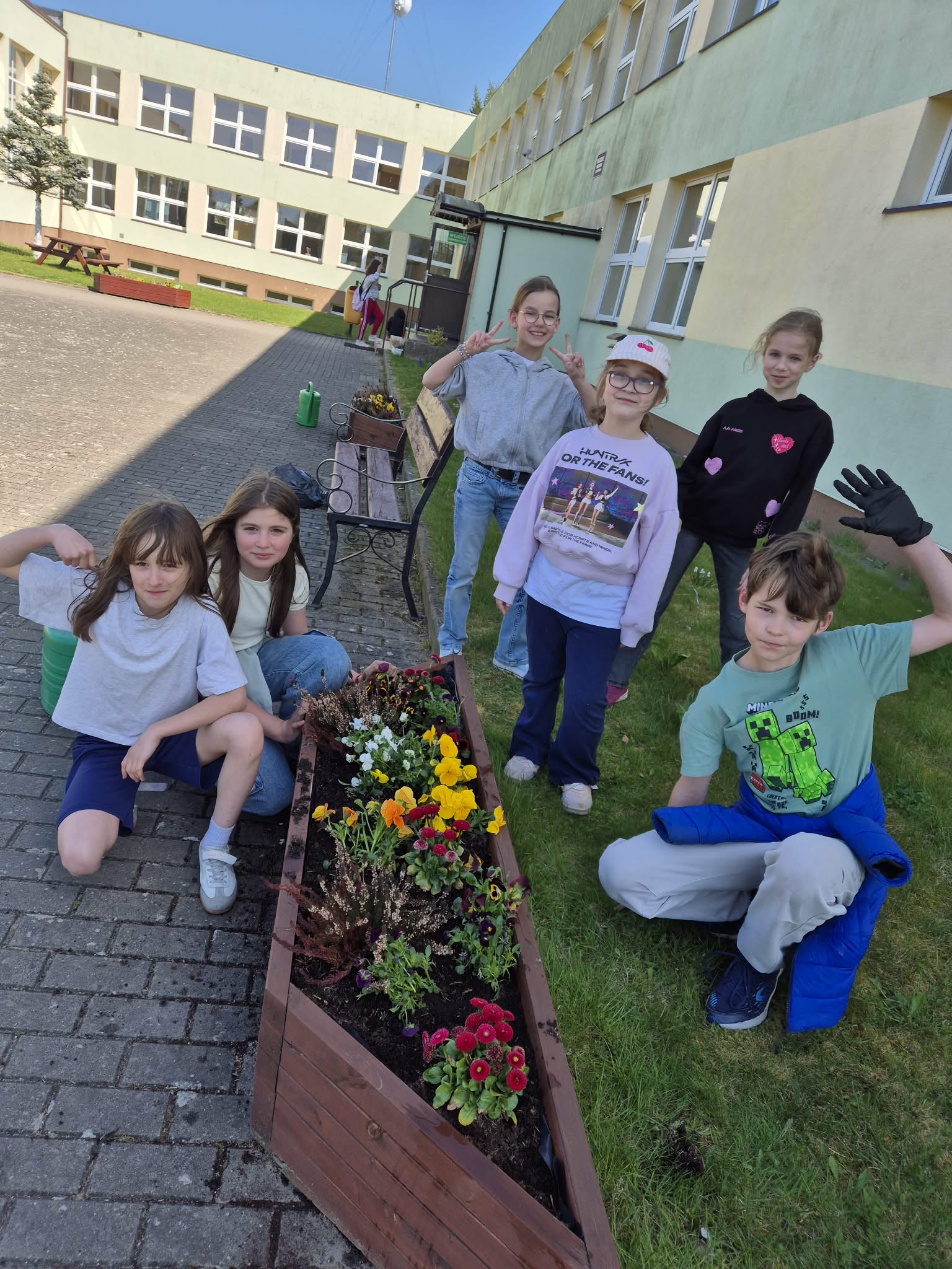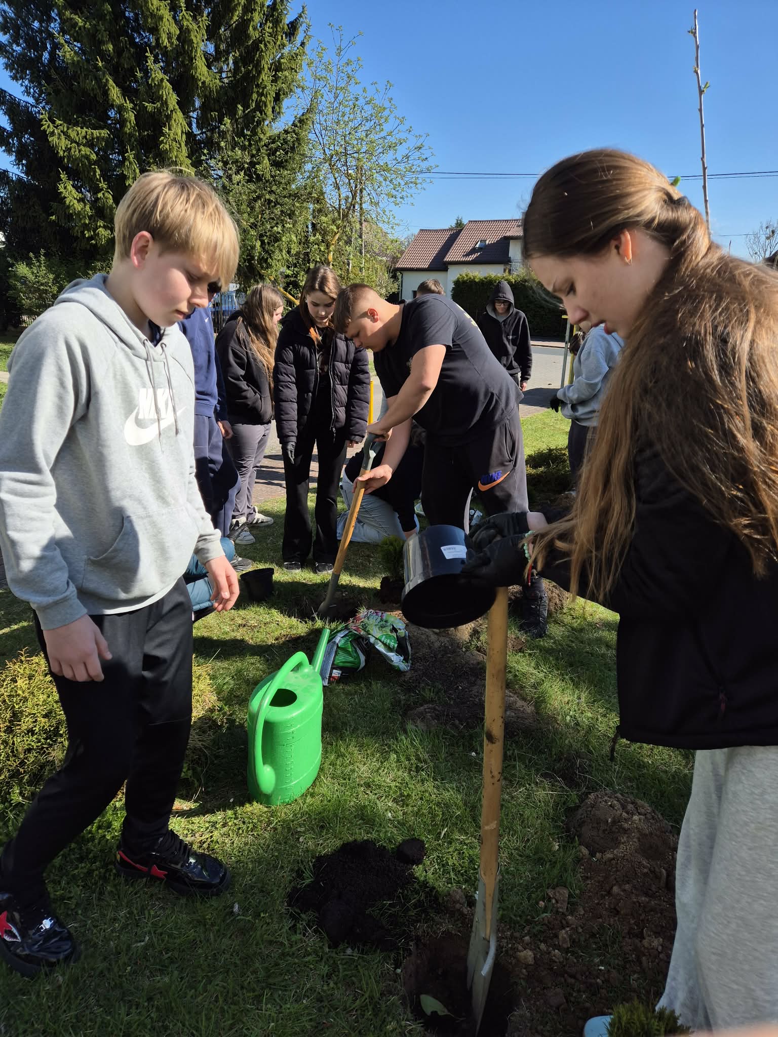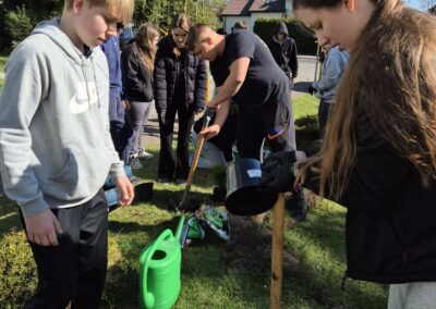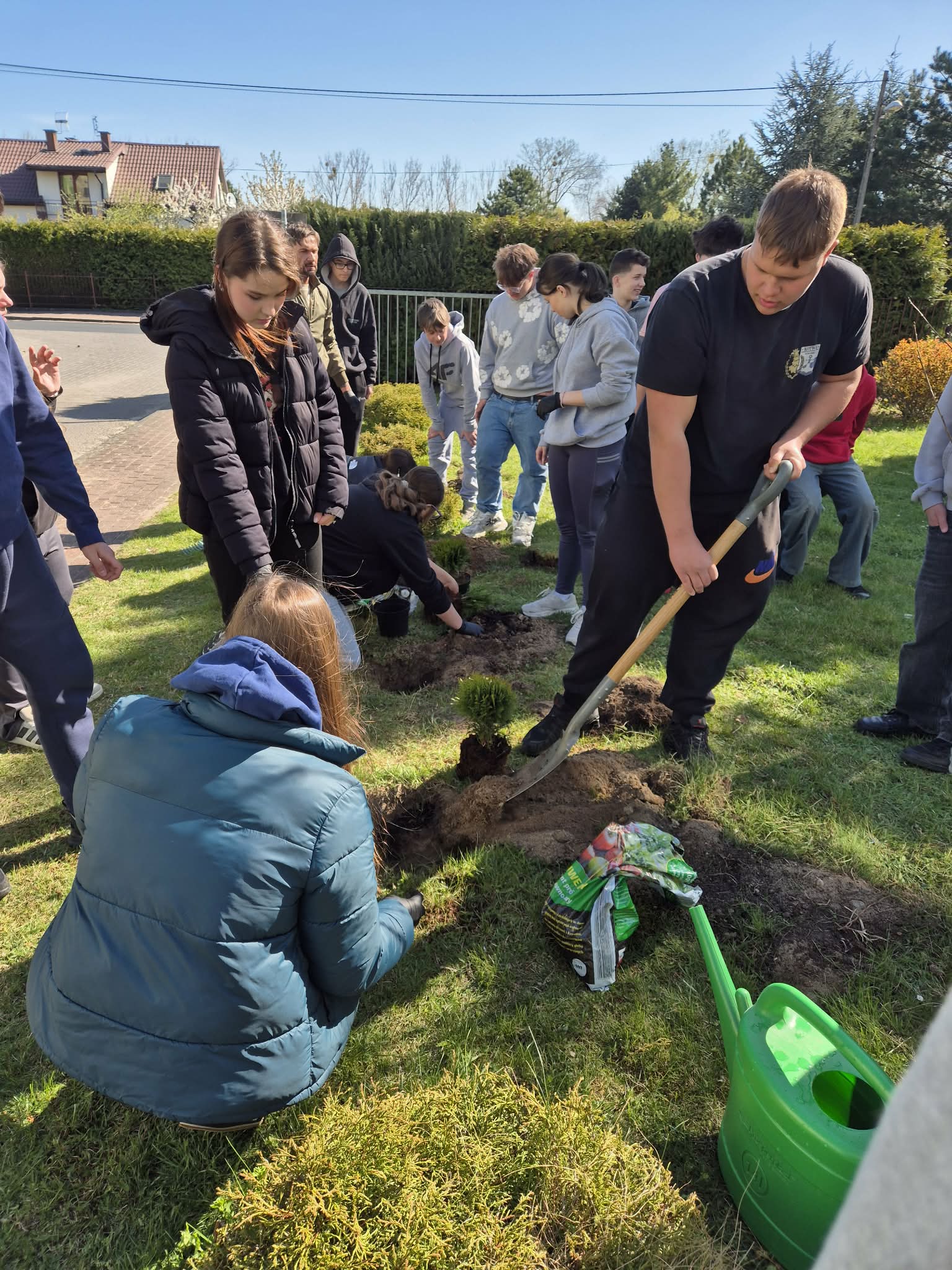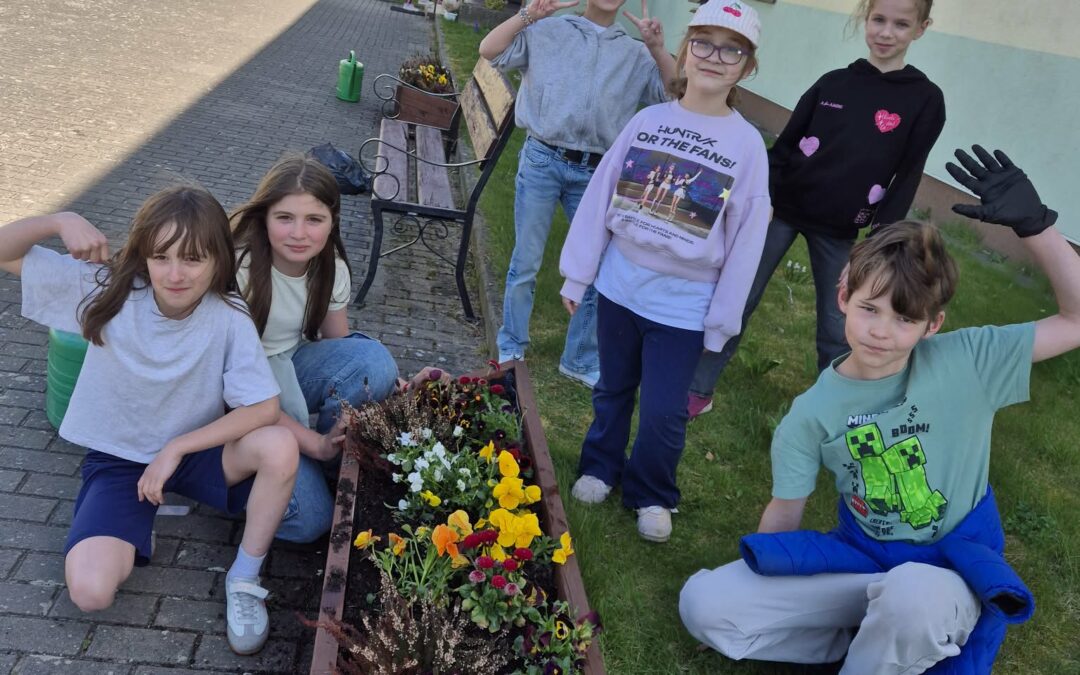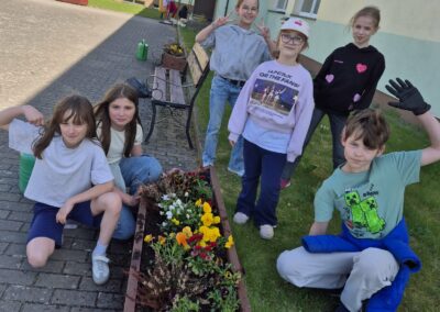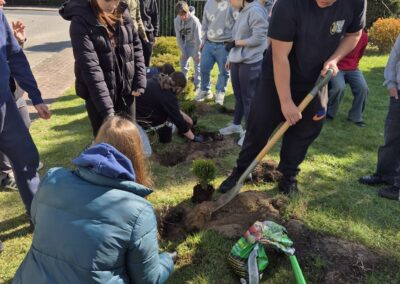 Uczniowie klas 7-8 sadzili tuje, kwiaty oraz lilaki, przyczyniając się do upiększenia otoczenia szkoły.